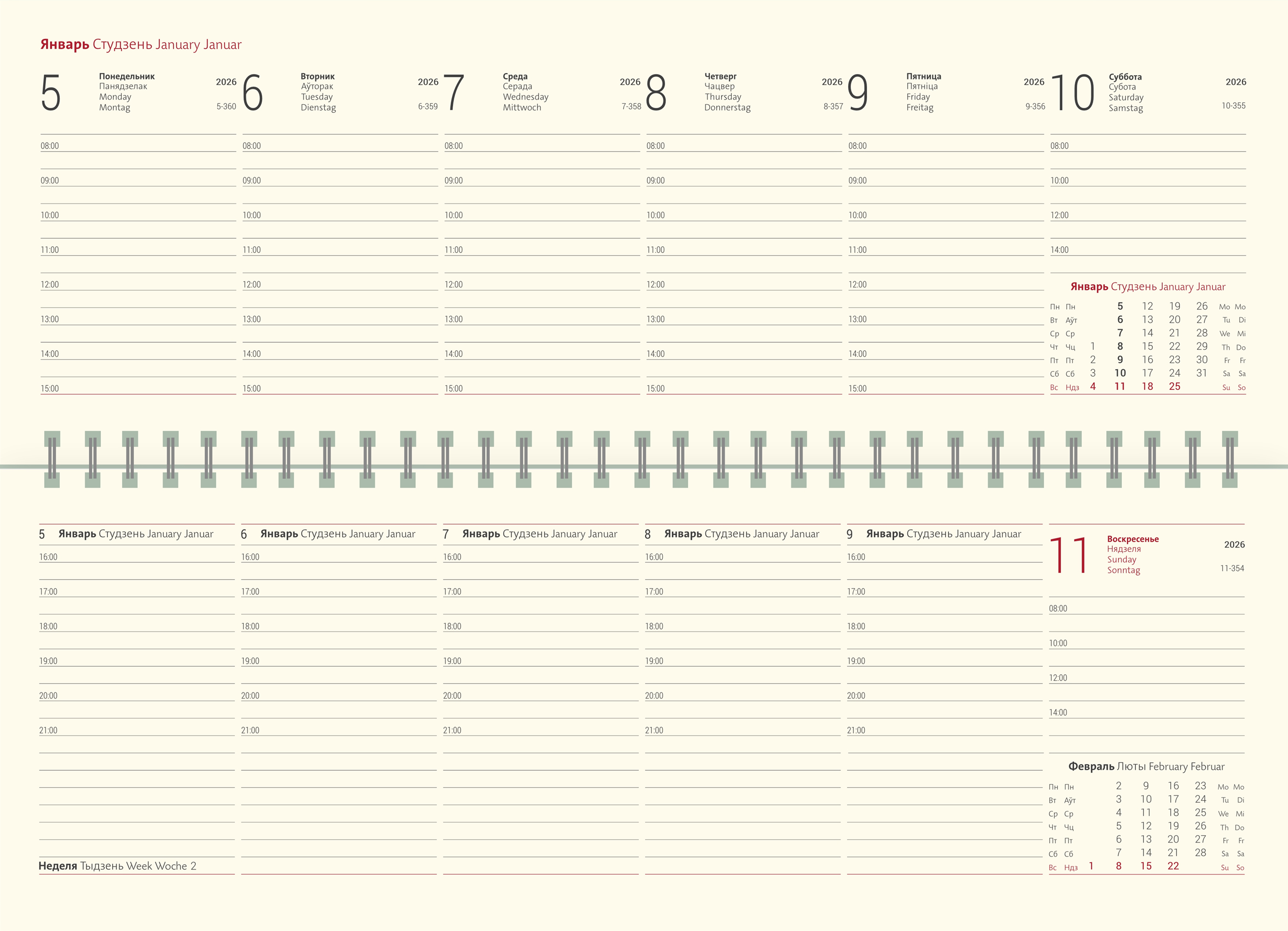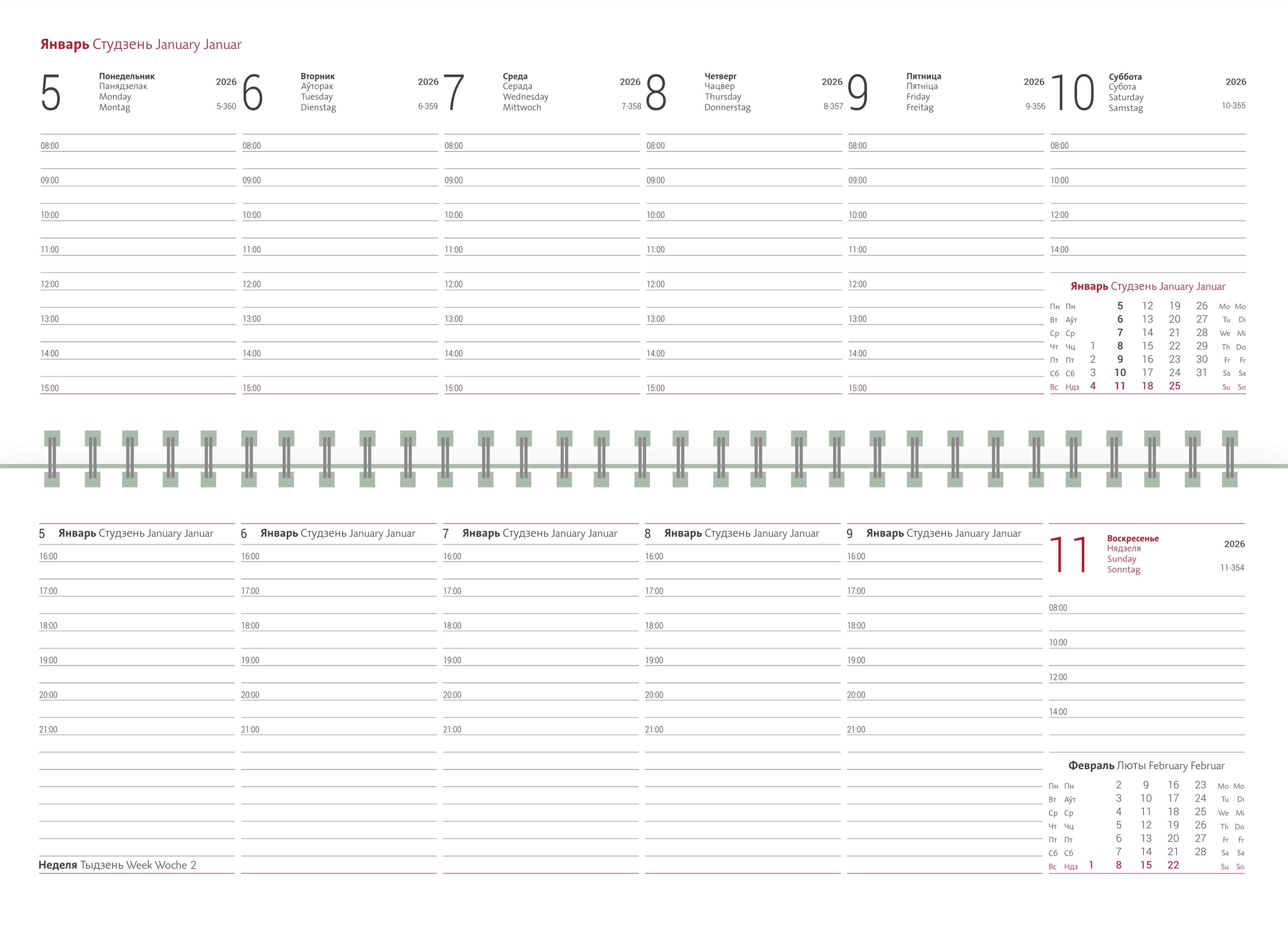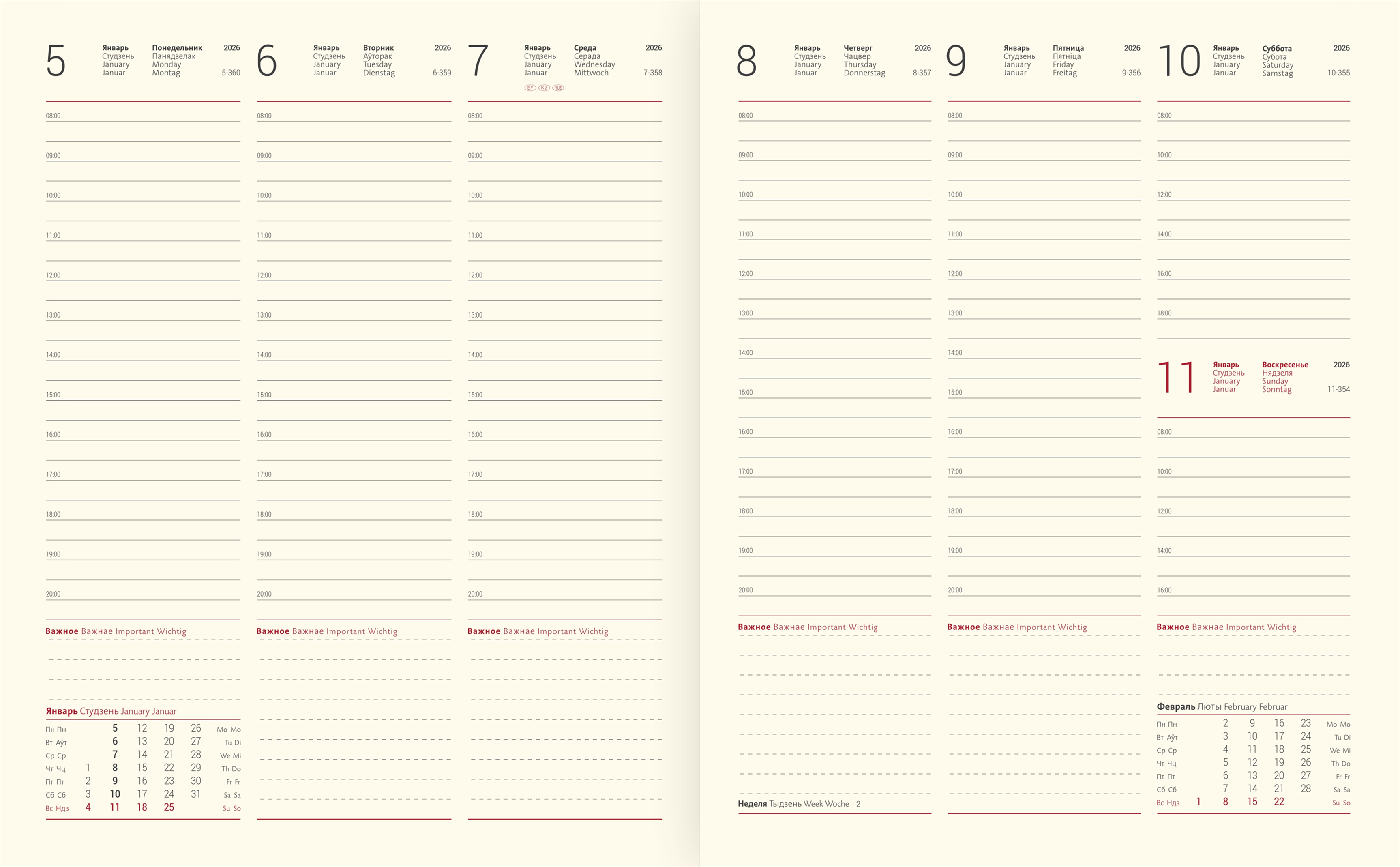 Еженедельник датированный V65 21х26 см тонир.бумага. Формат 21х26 см, датированный блок на 4 языках (в том числе на белорусском и русском), тонированная бумага, серо-бордовый цвет графики,144 стр, перфорация угла страницы, шёлковое ляссе, справочная информация. SHERWOOD - мягкая гладкая обложка с эффектом лайковой кожи и лёгким блеском.