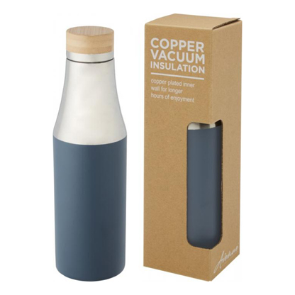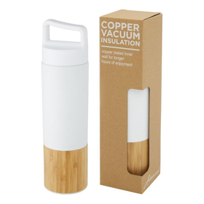 Бутылка из нержавеющей стали 18/8 с медной ваккумной изоляцией, которая сохраняет напитки горячими или холодными в течение нескольких часов. Имеет модный элемент из бамбука; бутылку легко носить с собой благодаря ручке на верхней части крышки. Бутылка имеет широкое горлышко, поэтому ее легко наполнять и мыть. Протестировано и одобрено согласно немецкому законодательству о безопасности пищевых продуктов (LFGB), а также проверено на содержание фталатов согласно нормам REACH. Объем 540 мл. В подарочной коробке из переработанного картона. Нержавеющая сталь, бамбуковое дерево.