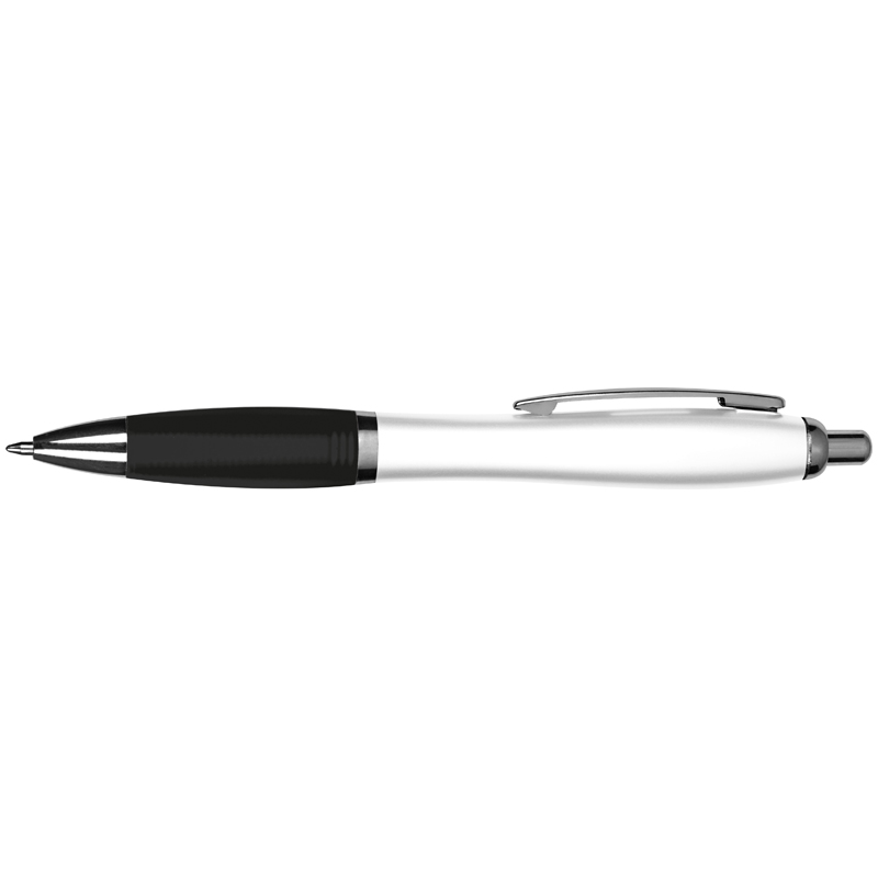 Пластиковая ручка с белым корпусом и цветной резинкой. Имеет металлический клип и большой синий стержень. Логотип можно разместить под клипом.