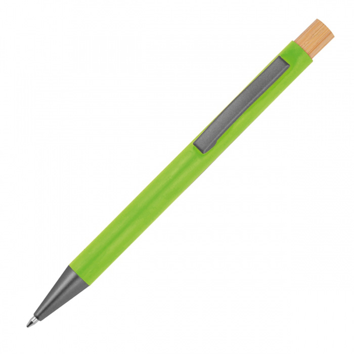 Ручка из переработанного алюминия с бамбуковой кнопкой, металлическим зажимом и чернилами синего цвета. Рядом с зажимом может быть нанесён ваш логотип.