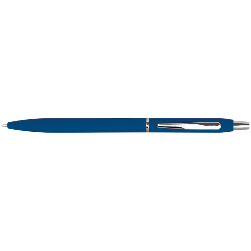 Тонкая, прорезиненная металлическая ручка с синим стержнем. Логотип можно разместить под клипом.