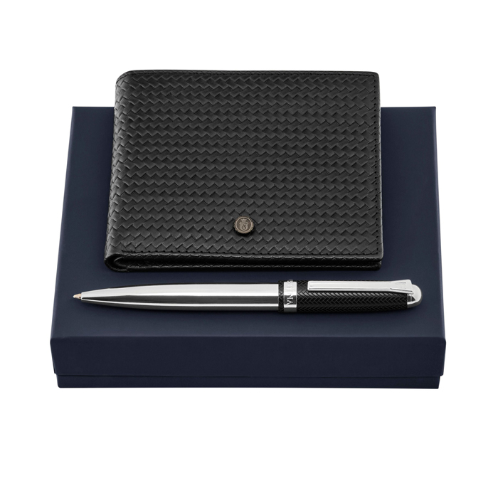 Набор из кошелька для кредитных карт Interlace Black и шариковой ручки Classicals Interlace Chrome. Set FLW629A + FSN6524B. Материал: латунь, овчина, воловья кожа, полиэстер. Размер: 162 x 127 x 40 мм.