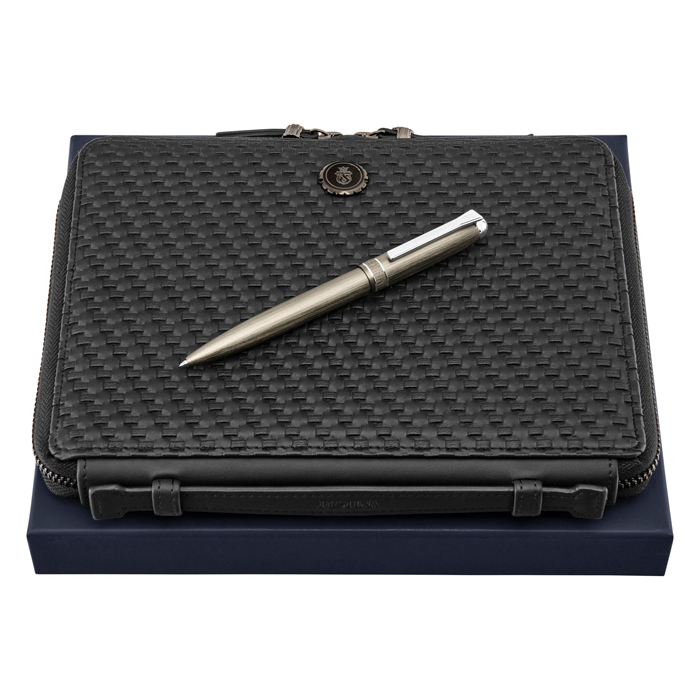 Набор из ручки-роллера Classicals Brushed Gun & Chrome и папки для участника конференции формата А5 Interlace Black. Set FSW6415D + FTM629A. Материал: алюминий, латунь, полиуретан, бумага. Размер: 230 x 190 x 30 мм.