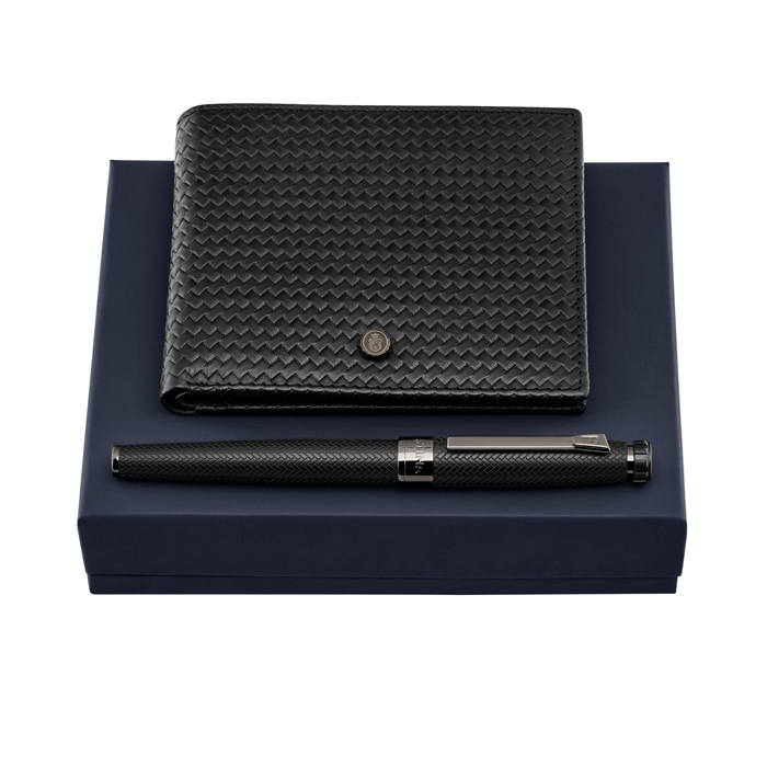 Набор из кошелька для кредитных карт Interlace Black и ручки-роллера Interlace Black. Set FLW629A + FSI6295A. Материал: латунь, овчина, воловья кожа, полиэстер. Размер: 162 x 127 x 40 мм.