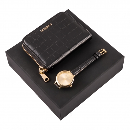 Интересный письменный набор изготовленный из металла. В состав набора входят шариковая ручка (поворотный механизм) и шариковая ручка с кнопкой (обе пишут чёрным цветом). Набор упакован в черно-белую коробку с магнитной кнопкой.
