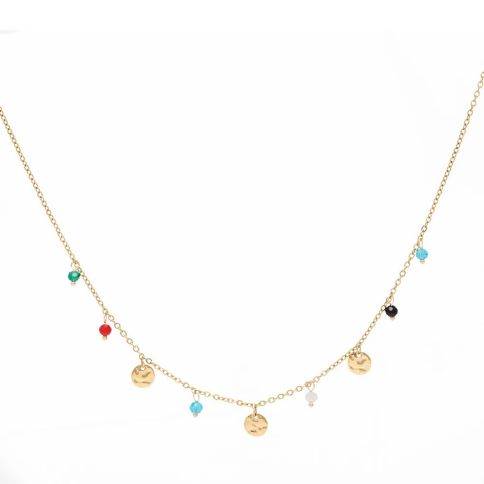 Изящное ожерелье Séraphine Gold украшено мелкими разноцветными бусинами, которые придают очарование его золотистому оттенку. Ожерелье легко сочетается с другими украшениями или носится отдельно, добавляя мягкий, яркий акцент любому образу, сохраняя при этом изысканность и непринуждённость. Дополненное неброской фирменной подвеской Cacharel, ожерелье становится элегантным выражением стиля.
