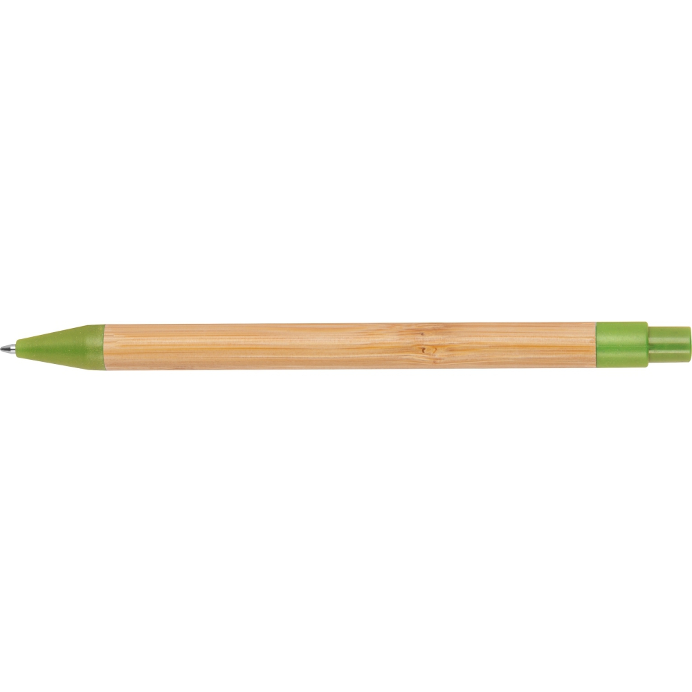 Выдвижная шариковая ручка из бамбука с цветными аппликациями из пшеничной соломы и синим стержнем для письма.