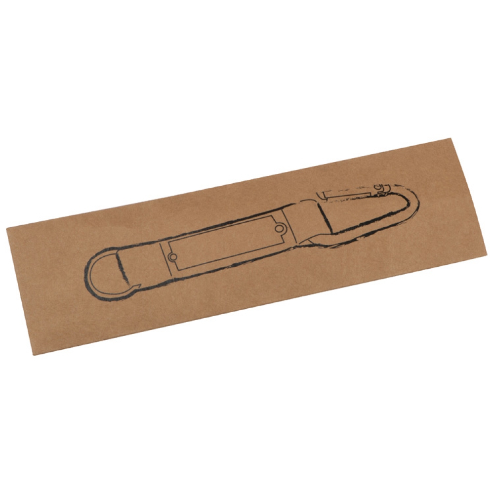 Брелок с карабином на ремешке. В середине ремешка находится табличка, на которой можно разместить логотип.